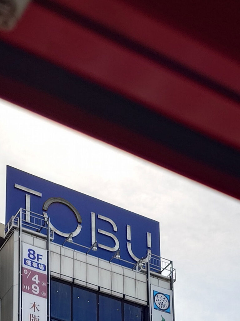 池袋駅西口の地上で空を見上げて、写真にある青い看板を探してください