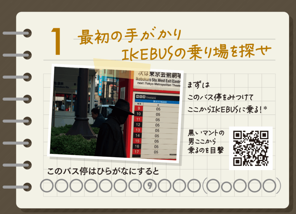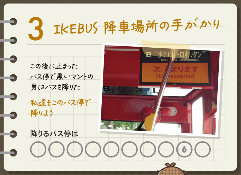 車窓探偵の最初の場所「IKEBUSバス停 池袋駅西口(中央)」がこの期間は利用できないため、次の様に進めるようお願い申し上げます。